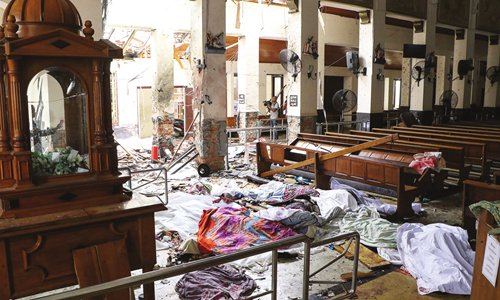 Sri Lankan security personnel walk past bodies covered with blankets amid debris at St. Anthony’s Shrine following an explosion in Kochchikade in Colombo on Sunday. A string of blasts ripped through high-end hotels and churches holding Easter services, killing at least 215 people. Photo: AFP