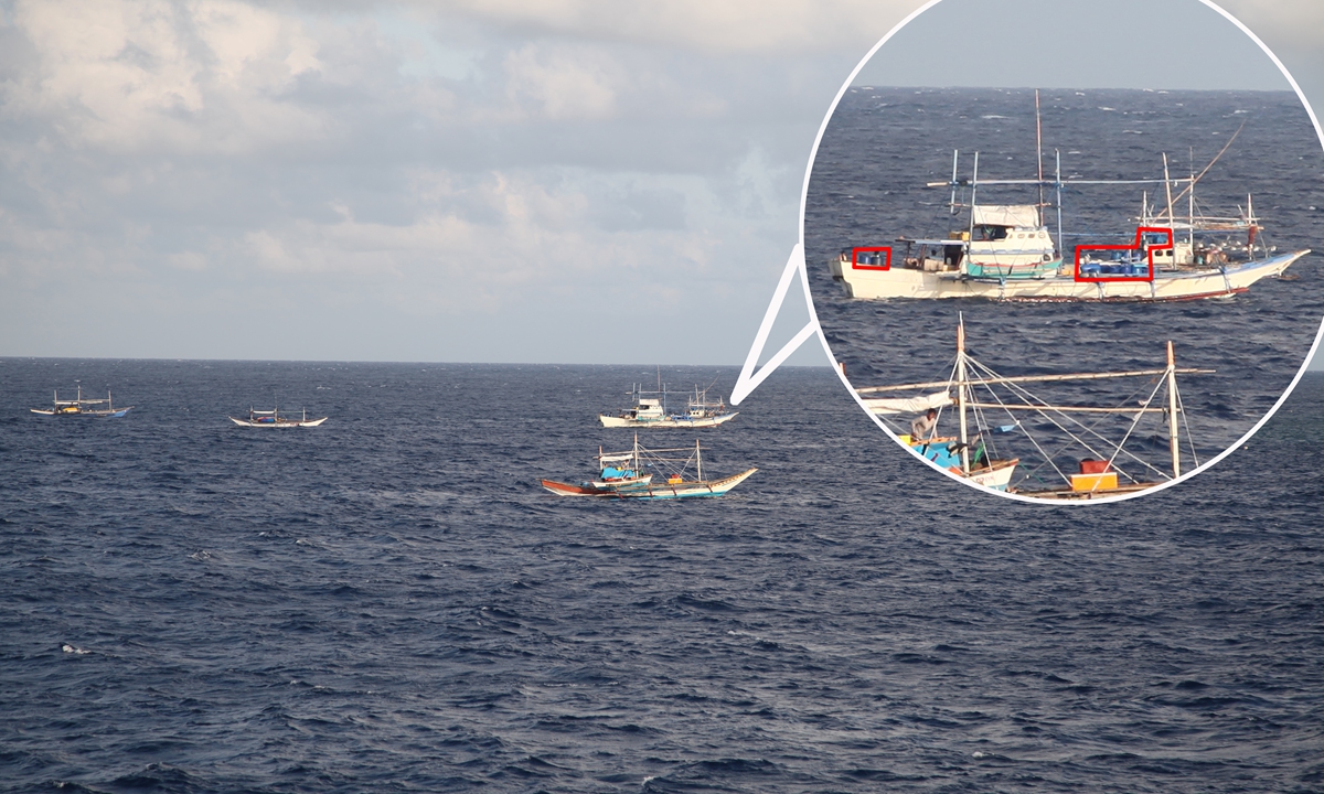 Led by a mothership apparently carrying barrels of fresh water and fuel, a group of Philippine fishing ships attempt to conduct right-infringing activities in waters around China’s Houteng Jiao in the South China Sea under the pretext of fishing in November 2024. Photo: Courtesy of the China Coast Guard