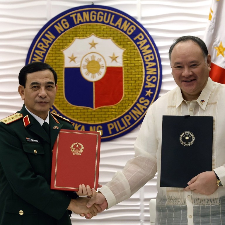 Minister obrony Wietnamu Phan Van Giang (po lewej) i jego filipiński odpowiednik Gilberto Teodoro trzymają dokumenty podpisane po dwustronnym spotkaniu w Departamencie Obrony Narodowej w Quezon City, Metro Manila, Filipiny, w piątek. Zdjęcie: EPA-EFE